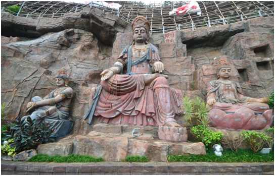 客家人信仰主要以佛為主,因此,蘇氏山水結(jié)合當(dāng)?shù)氐娘L(fēng)土民情以觀音佛像展示佛家之大成,在施工過(guò)程中,結(jié)合地質(zhì)及山體自身因素及佛像本身載重等綜合考量,原預(yù)計(jì)采用GRC假山制作方案被蘇氏山水否決,而采用直塑的形式。此處,因道路交通不便,在直塑過(guò)程中運(yùn)輸及起重成為了施工的難點(diǎn),對(duì)此蘇氏山水采用骨架形式焊接山體再塑形的模式出色的完成了景觀墻的改造工程,這也是繼東部華僑城后的又一次創(chuàng)新。蘇氏山水在不斷的自我提升,借鑒以往工程遇到的問(wèn)題不斷完善,最終超預(yù)期的完成了客家風(fēng)景文化墻的建設(shè),得到了客天下的高度認(rèn)可。
